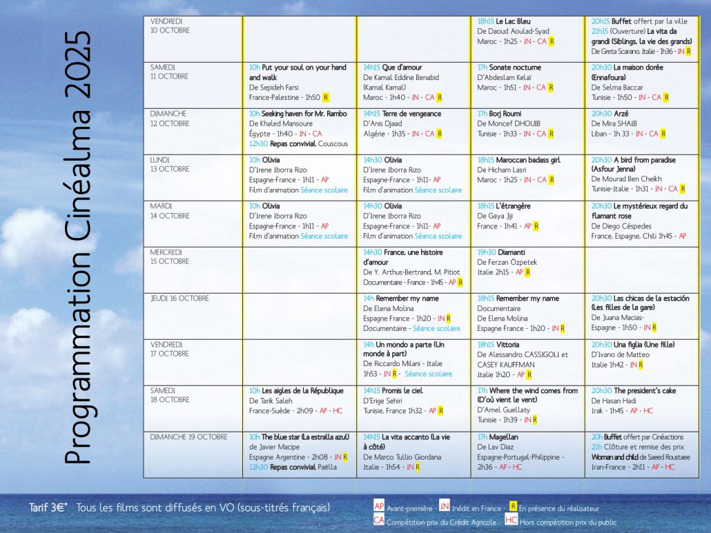 Cinéalma propose environ 35 films de différents pays du large bassin Méditerranéen, dont près de la moitié inédits. Un jury attribue le prix du Crédit Agricole pour les films inédit (n’ayant pas de distributeurs en France. Plus largement, le vote du public récompense trois films diffusés lors du festival.
